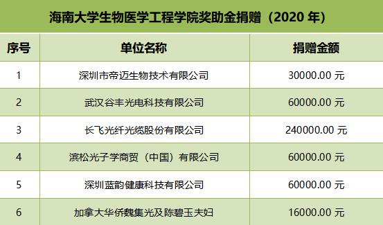 学院在2020年与深圳市帝迈生物技术有限公司、武汉谷丰光电科技有限公司、长飞光纤光缆股份有限公司、滨松光子学商贸(中国)有限公司、深圳蓝韵健康科技有限公司、加拿大华侨魏集光及陈碧玉夫妇签订了奖助学金捐赠协议。奖助学金总额为四十六万六千元,将用于本学院学生的奖学金、助学金、比赛奖金、活动补贴等方面。