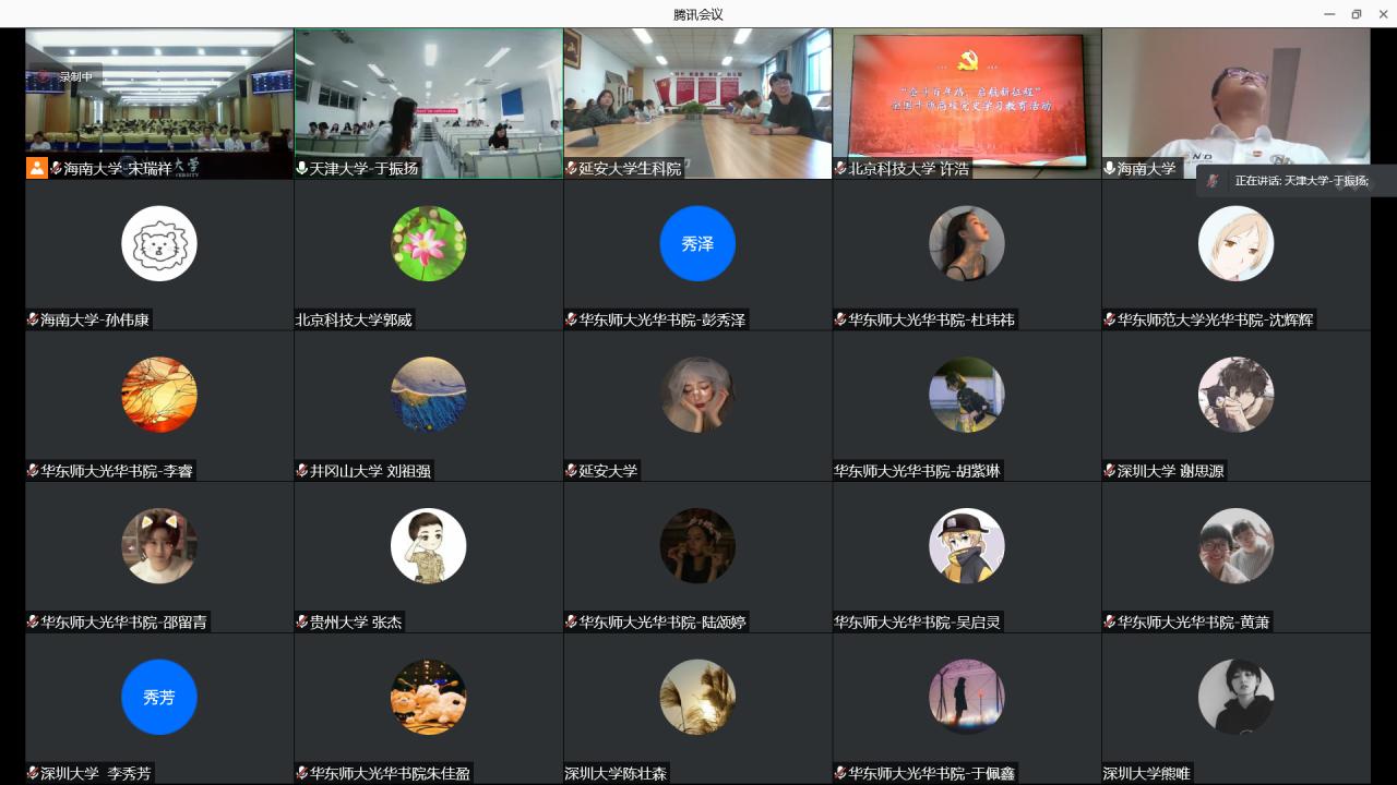 孙伟康发表了《艰苦卓绝,孤岛奋战,二十三年红旗不倒》的演讲,介绍了海南琼崖可歌可泣的革命奋战史和艰苦卓绝的橡胶种植历程,这种英勇顽强、开拓进取的精神成为了现今海南的自贸港建设的奋斗内驱力;贵州大学张杰发表《那盏照亮中国的马灯—苟坝会议》演讲,从历史背景到会议内容再到现实意义,让我们了解到如今苟坝村道路两侧的马灯,不仅照亮了漆黑的深夜,也见证了毛泽东挽救红军、改写中国命运的历史瞬间;延安大学的周婵以《中共七大召开的历史背景和现实意义》为题,向我们阐释了中共七大召开的历史背景及现实意义,让我们深刻认识到党的谋略与远见;深圳大学刘雨佳以《深圳特区的改革先锋袁庚》为题,讲述了袁庚披荆斩棘,突破僵化的计划经济体制,引入了市场经济从而引导了那个时代的潮流;北京科技大学许浩以《小小钢球所蕴含的科技报国情怀-我听胡院士讲党史》为题,从小小的钢球出发,动情的讲述了他的老师胡院士拳拳的爱国心和科技报国的艰难历程。华中科技大学黄士娟发表《从抗战到抗疫,时82年的两次武汉战斗》演讲,给我们讲述了时隔82年的两次武汉战斗史,虽然战斗性质不同,但武汉精神却在一直延续;在学生代表们的动情讲述中,我们重温了那段悲壮的革命岁月,也将坚定不移的跟党走中国特色社会主义道路,为全面建设社会主义现代化国家、实现中华民族伟大复兴中国梦贡献青春力量。