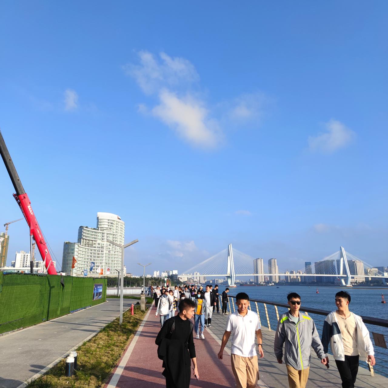 新南门→世纪大桥→泄湖木栈道设置,在每个休息点还安排有“接力比赛” 和“你比我猜”等互动小游戏,以各队积分发放活动奖励。伴随着优美的海景,队伍浩浩荡荡地出发了。大家一路欢歌笑语,在风光旖旎的海口湾盛景中相伴而行,尽情挥洒欢乐与激情,沿途拍照记录魅力风景与美好时刻。在向终点进发的路上,师生们时而被游戏关卡绊住脚步,面露愁容,苦苦思索“获胜秘籍”,时而突破障碍,欢呼雀跃,冲向胜利的终点。无论结果如何,在整个活动中,大家始终热情高涨,积极参与。终点上,根据积分宣布了比赛结果,并进行颁奖仪式。至此,徒步活动圆满结束!