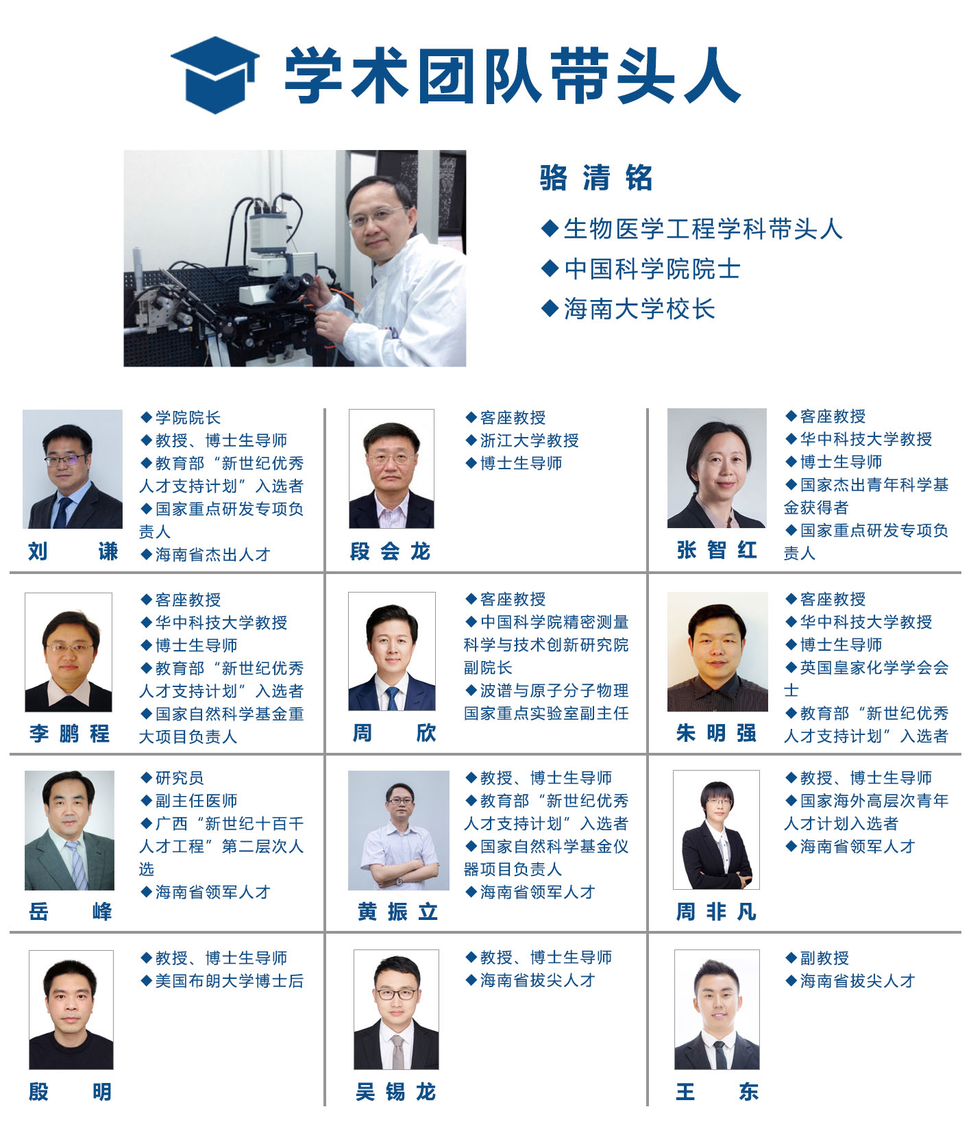 学院已建成一支以骆清铭院士为带头人的多学科交叉、以优秀中青年博士为主的高水平师资队伍。目前,学院设立了生物医学影像学、医学信息学、生物医学传感和体外诊断技术四个研究方向,依托校内教授和柔性引进客座教授组建了13支科研团队。