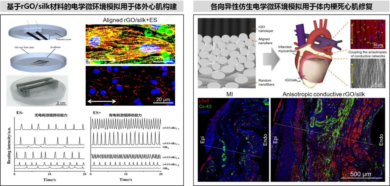 电兴奋组织的体外构建和体内修复具有重要意义,并且在研究方法和应用策略上具有一定共通性。其中,心血管疾病是致死率最高的疾病,导致患者生活质量下降和巨量国民经济损失,发病率高且病情凶险的心肌梗死会导致局部心肌功能缺失和导电网络受损,因此通过生物材料或者工程化心肌组织改善梗死心肌功能具有重要临床意义。因此,基于柔性导电纤维材料开发了工程化心肌组织构建的平台,成功构建出定向生长的功能化心肌组织,进一步施加电刺激,证明了导电性、有序纤维形貌以及电刺激这三种仿生微环境因素对心肌组织功能蛋白表达和搏动能力的促进作用。并且,基于具有各向异性表面形貌和各向同性力学性质的导电纤维材料,在移植中将导电材料与在体心肌组织的各向异性导电方向相匹配,实现了各向异性电学微环境的仿生修复,验证了各向异性导电的纤维生物材料在改善梗死心脏功能中的较优作用,并初步揭示了其通过降低心律不齐发生率和促进微血管新生实现修复作用的机制。