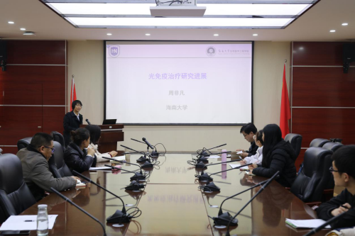 周非凡教授以肿瘤发生机理、研究进展、治疗方法为线索,巧妙地引出光免疫治疗肿瘤这一新进展。还与现有肿瘤治疗技术如化疗、手术、放疗等一一进行比较,突显了光免疫疗法深远的前瞻性。随后周非凡教授向河南大学生科院的全体研究展示了一些目前光免疫治疗的器械,吸引了在座同学们的学习兴趣。报告会结束以后,周非凡教授还和在座的老师和同学们进行了一系列相关问题的讨论, 学术氛围十分浓厚。