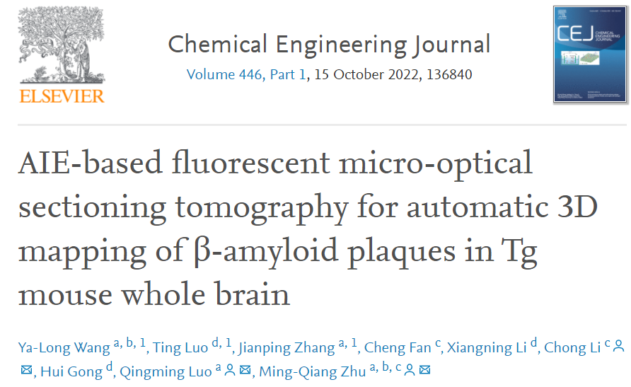 朱明强团队&骆清铭团队合作报道了一类AIE活性的水溶性Aβ探针,该类型探针比商用探针ThT对Aβ纤维具有更强的亲和力,表现出更出色的Aβ靶向性和特异性,并且可在小鼠脑组织内实现Aβ斑块的快速免漂洗标记。使用此原位标记探针结合荧光显微光学切片断层成像系统(fMOST),通过原位标记/成像/逐层切削的循环过程,实现了Tg小鼠全脑Aβ斑块的自动3D成像。此项研究成果以“AIE-based fluorescent micro-optical sectioning tomography for automatic 3D mapping of β-amyloid plaques in Tg mouse whole brain”为题发表在《Chemical Engineering Journal》(IF=16.744)上。