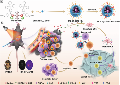 本研究开发了一种980 nm AIE吸收剂,即TPE-BT-BBTD,它具有所有报道的AIE分子中最长吸收波长及优异的光热转换性能,适用于近红外二区深度成像和光热治疗。通过与程序性死亡配体1 (αPD-L1) 抗体的共价连接,αPD-L1@TPE-BT-BBTD纳米颗粒则能同时满足深度成像,肿瘤靶向杀伤和免疫抑制逆转。这种独特的组合为通过局部干预诱导全身抗肿瘤反应来治疗转移性胰腺癌提供了新途径。