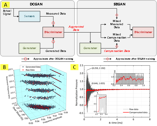 图 1 (A)系统整体框图,原始少量数据经过SEGAN的增强,送入DCGAN实现辨识能力训练最终实现对传感器的补偿。(B)增强数据与原始样本动态参数分布关系图。(C)阶跃信号补偿前后对比图。