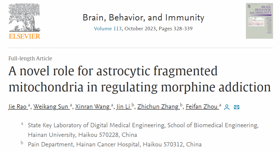 周非凡教授团队的最新研究成果“A novel role for astrocytic fragmented mitochondria in regulating morphine addiction”发表于权威杂志《Brain, Behavior, and Immunity》(中科院大类1区Top期刊,IF=15.1)。研究团队阐明了星形胶质细胞在吗啡诱导的神经炎症及成瘾中的重要性及调控机制,为成瘾机制研究提供了新的方向,并为成瘾治疗提供了潜在途径。