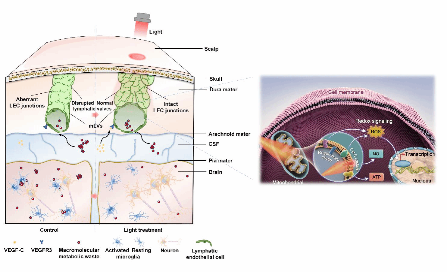 基于mLVs分布于硬脑膜这一浅表位置,周非凡教授团队提出通过光调控mLVs功能改善神经退行性疾病的治疗策略。该研究证实了经颅光刺激通过增强脑膜淋巴内皮细胞功能提升淋巴系统引流,进而促进衰老和AD小鼠的病理缓解和认知改善,为神经退行性疾病的改善提供了一种潜在的调控策略。